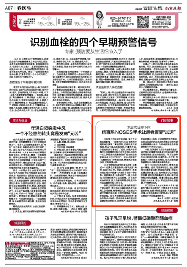 术后第2天就能下地走路,第6天达到出院标准……刚做完NOSES手术的肿瘤患者刘某说:“真没想到,这病不用开膛剖肚,打几个眼儿就能完成,少遭罪不说,心里也没那么害怕了。”近日,东南大学附属中大医院胃肠外科石欣主任团队成功为一名乙状结肠肿瘤患者完成“经自然腔道取标本手术(NOSES)”。该手术实现了“无辅助切口”的微创突破,患者术后恢复迅速,已经康复出院。