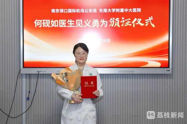 出席颁证仪式的东南大学附属中大医院党委书记汤勇明表示,何砚如医生在机场紧急救人的行动,充分彰显了中大医院医务人员的社会责任与担当。仅今年以来,医院已有多名医务人员在机场、高铁站等公共场所践行救死扶伤使命,成功抢救多名患者。医院为他们的义举深感自豪与骄傲,同时也鼓励更多医务人员发挥专业优势,积极参与各类救死扶伤及见义勇为行动,以实际行动传递医者温度与社会正能量。