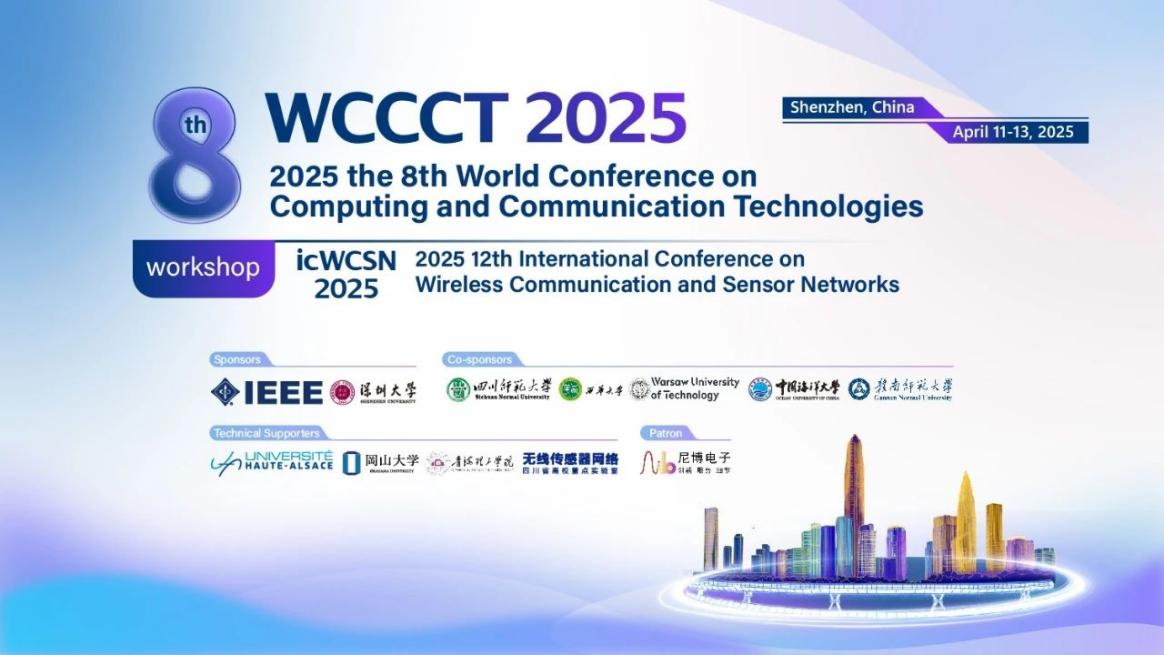 2025年4月11日至13日,第八届计算和通信技术国际会议 (The 8th World Conference on Computing and Communication Technologies ,WCCCT 2025)在深圳召开。本届会议由IEEE和深圳大学主办,深圳大学电子与信息工程学院承办,四川师范大学、西华大学、华沙理工大学、中国海洋大学,赣南师范大学联合协办。上阿尔萨斯大学、冈山大学、青海理工学院、无线传感器网络四川省高校重点实验室提供技术支持,上海尼博电子科技有限公司赞助支持。