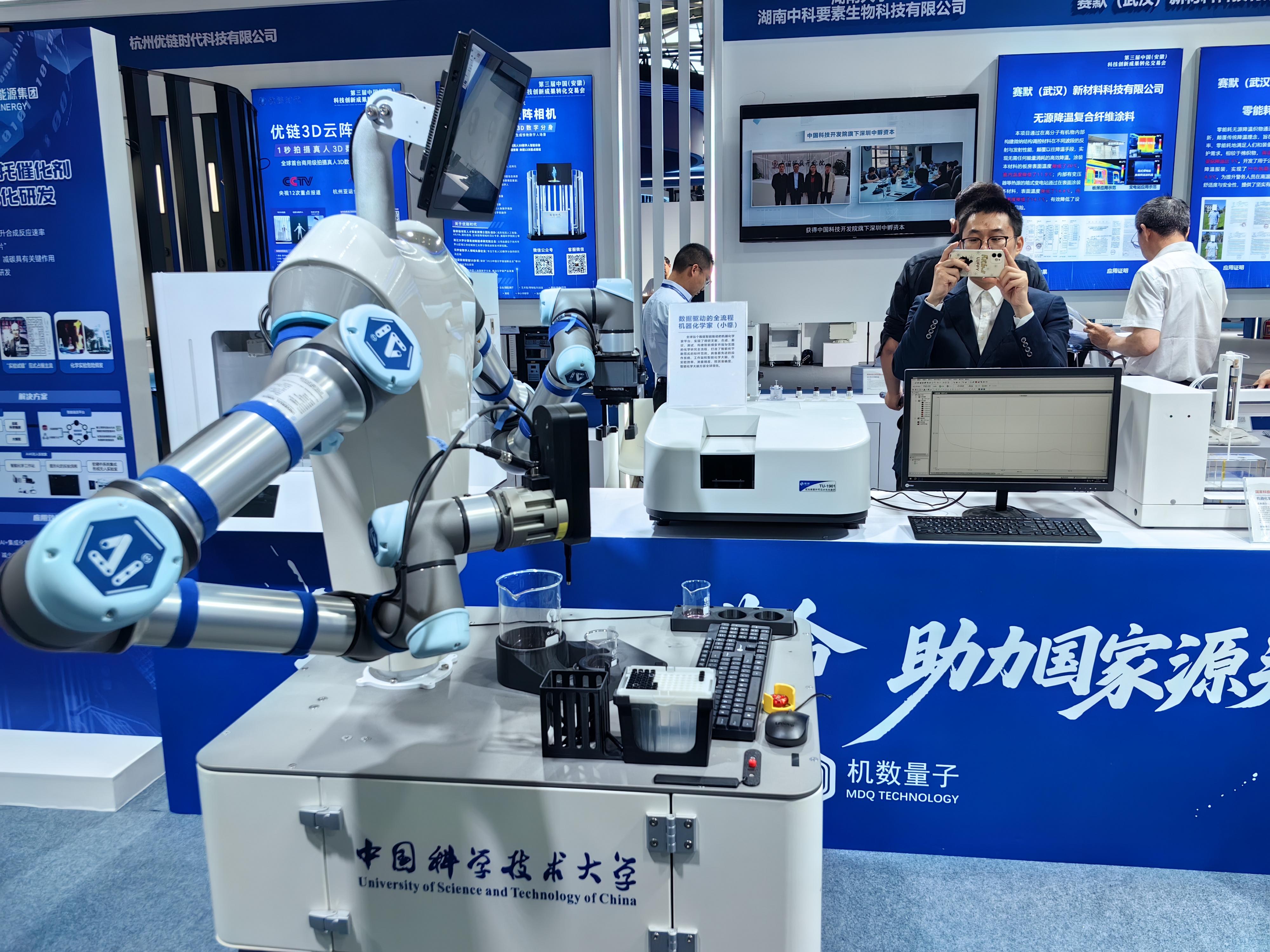 “在实验室中,机器化学家是材料研发领域的智能科研助手,通过将先进科研方法进行系统化转化,为企业或科研院所提供科研助力和赋能。”合肥机数量子科技有限公司市场营销部业务经理姚爱华说。