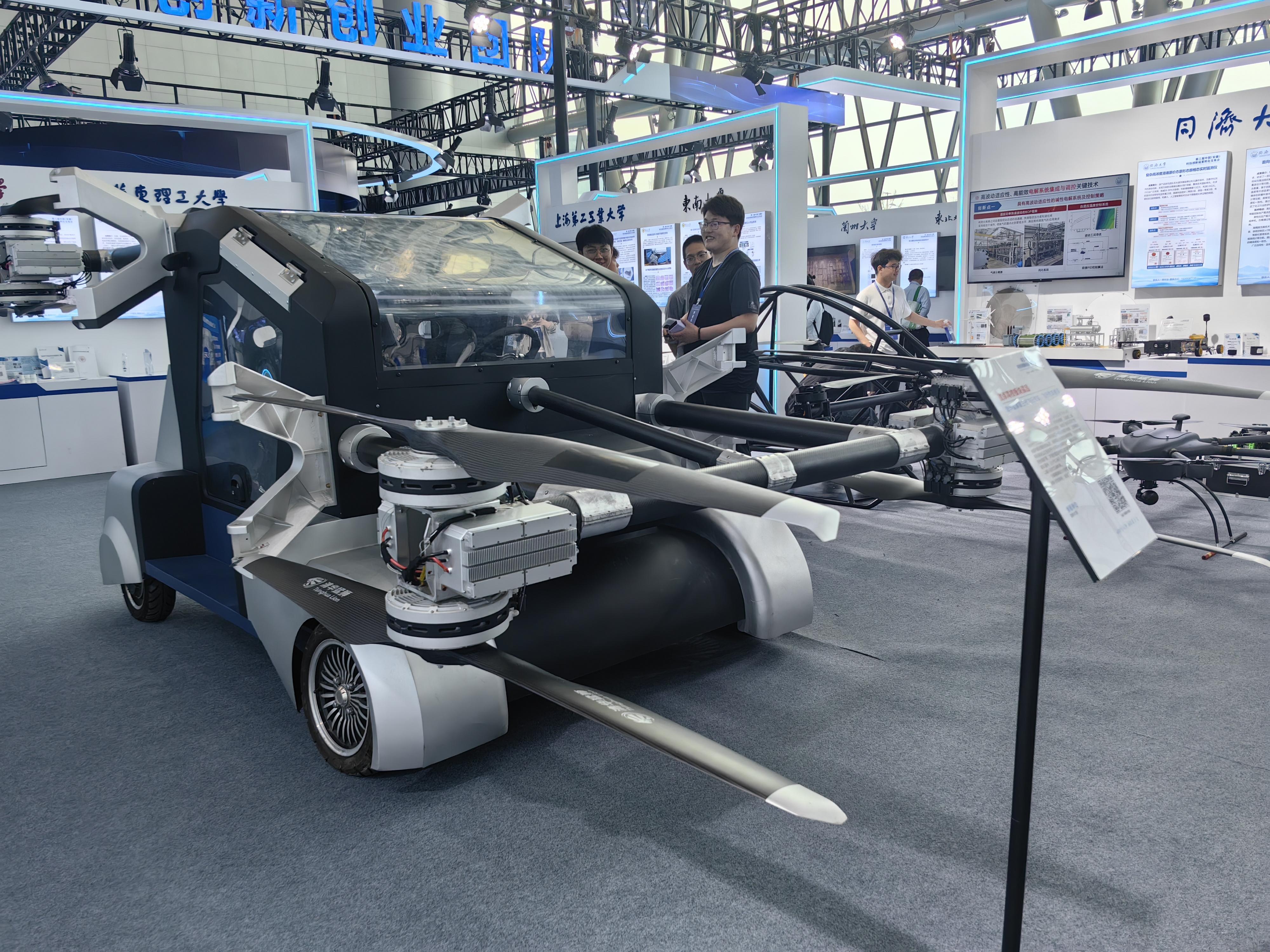 在重点高校板块,记者见到了由清华大学全球首发的“猛狮第三代飞行汽车”。“这款产品借鉴蜻蜓灵活度高、模态转换迅速的生物构造优势,设计了轻量化且紧凑的结构,能更好满足城市立体交通环境的行驶需求,是解决未来城市交通拥堵难题的理想选择。”清华猛狮智能飞行汽车项目市场总监董一帆说。
