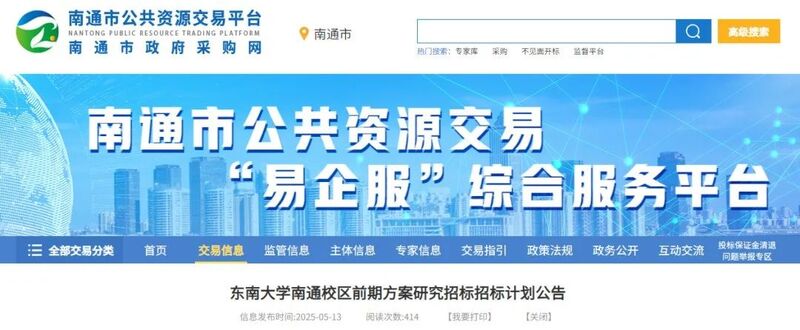 交汇点讯 5月13日,南通市公共资源交易平台发布了《东南大学南通校区前期方案研究招标招标计划公告》。根据公告,东南大学南通校区项目计容面积约43万平方米,中标人须完成东南大学南通校区前期方案研究,合同估算价为1800万元。这意味着,东南大学南通校区筹建工程迈出了坚实的一步。