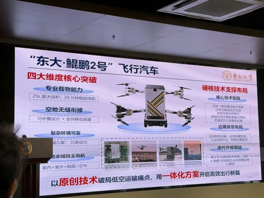能行走、会飞行,先载货、后载人,先郊区、后城区……1月23日,东南大学飞行汽车团队正式发布“东大·鲲鹏2号”,一个自重75KG、高0.9米、宽0.6米,携带可折叠四轴八旋翼的飞行汽车。