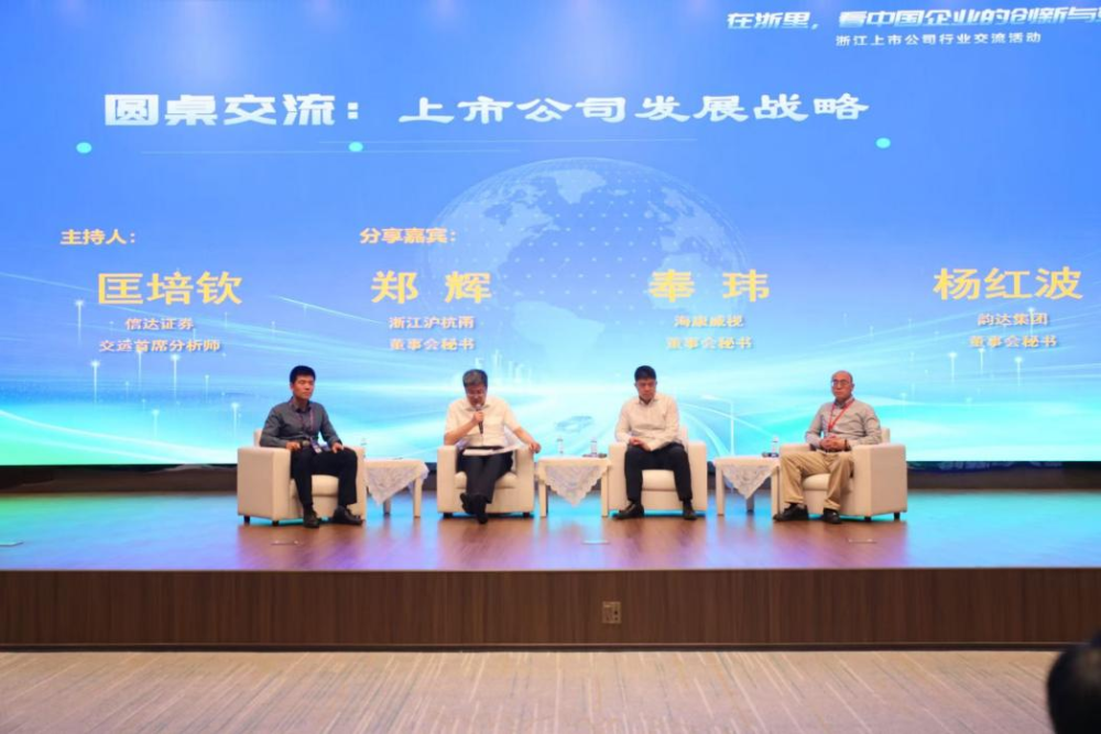 在圆桌交流环节,信达证券交通运输行业首席分析师匡培钦与浙江沪杭甬高速公路股份有限公司董事会秘书郑辉、杭州海康威视数字技术股份有限公司董事会秘书奉玮、韵达控股集团股份有限公司董事会秘书杨红波等企业高管一道,围绕行业竞争格局演变、新兴技术应用前景等热点议题展开深度研讨。嘉宾们结合企业战略实践,就分析师与投资者关注的核心问题进行专业回应,为资本市场与企业间的双向沟通搭建高效桥梁。