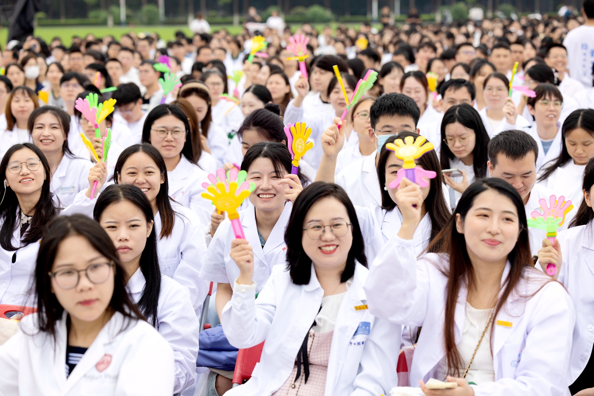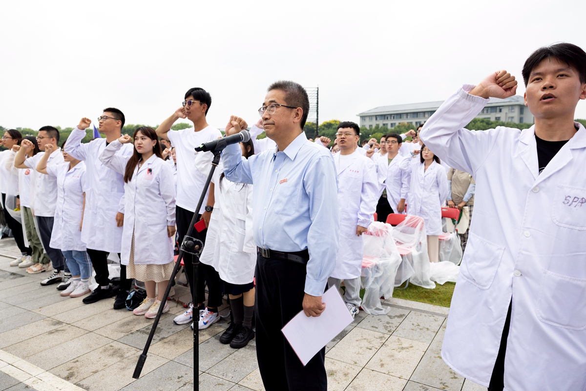 “健康所系、性命相托……”在副校长邱海波的带领下,全体医学生进行宣誓,开启医学生迈入医学大门的第一课,许下医者仁心的郑重承诺。