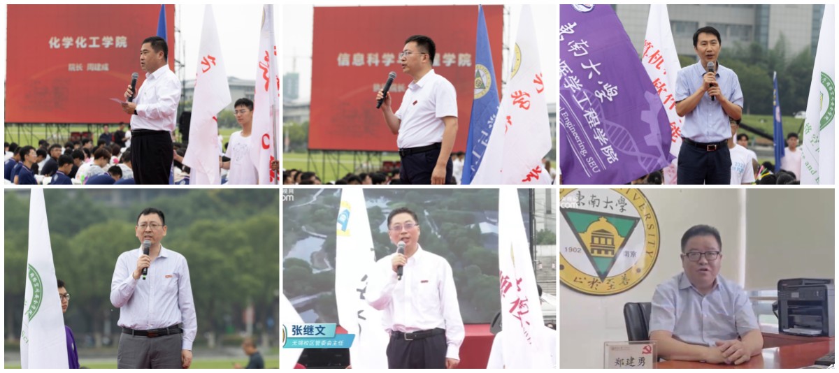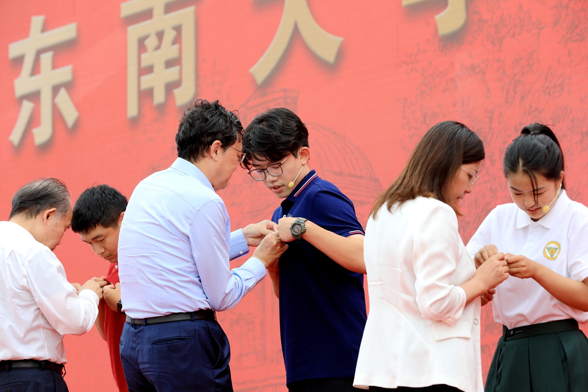 典礼上,参会的两院院士、校领导、各院系领导为2023级新生代表佩戴校徽。一枚枚“东南大学”校徽别于胸前,一句句新生誓词响彻全场,万余名新生从此正式成为一名光荣的东大人。