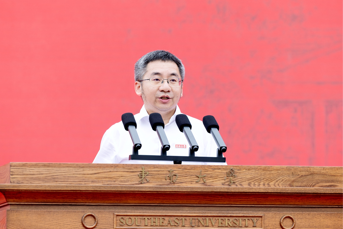 东南大学1994级校友、上海概伦电子股份有限公司董事兼总裁杨廉峰作为校友代表发言。他深情回顾了自己求学东大、见证科技高速发展的历程,并就如何把握时代机遇,与同学们分享了三点感悟:一是要理论结合实践,寻找个人的兴趣点和兴奋点;二是要主动沟通,坦然面对失败;三是要保持专注,以坚持创造时代价值。他希望东大人胸怀“国之大者”,追求卓越,勇毅前行,以技术创新,争当伟大理想的“追梦人”。