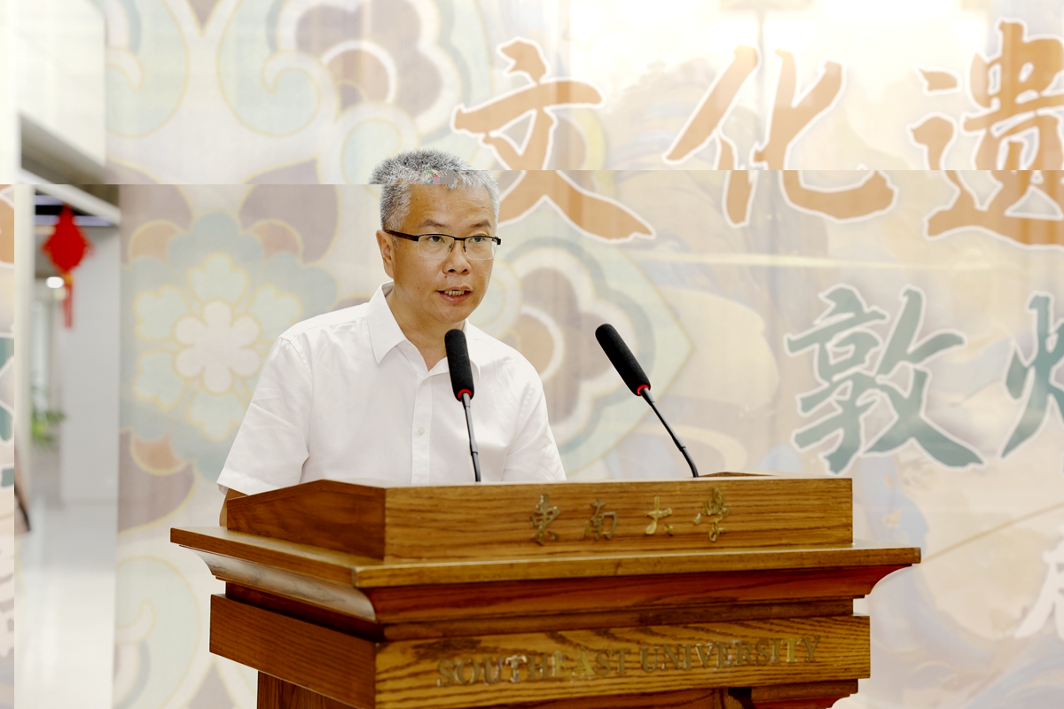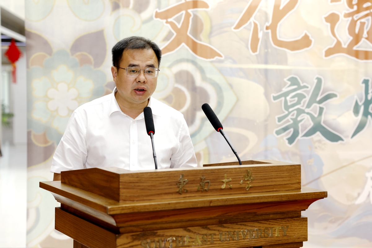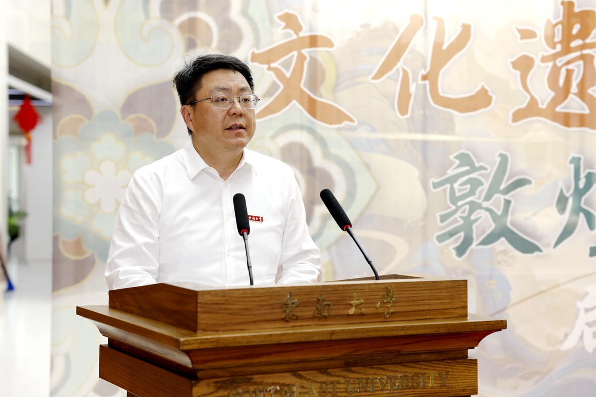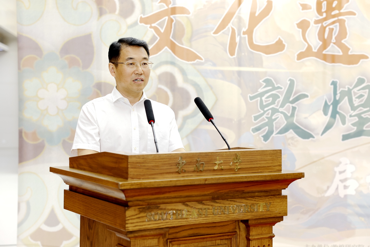 郭青林表示,“敦煌壁画艺术精品高校公益巡展”时隔7年再次走进东南大学,通过数字技术复制经典作品,完整保存了敦煌石窟艺术的信息,真实地再现了敦煌艺术的神韵。期待通过展览让广大青年学子共享科技发展成果、关爱文化遗产,让祖国优秀传统文化薪火相传。他希望能与学校共同提升文物科技创新能力和文物领域科技应用水平,引领文化遗产保护行业的发展,为“共同守护好全人类的文化瑰宝和自然珍宝,推动构建人类命运共同体”做出新的贡献。