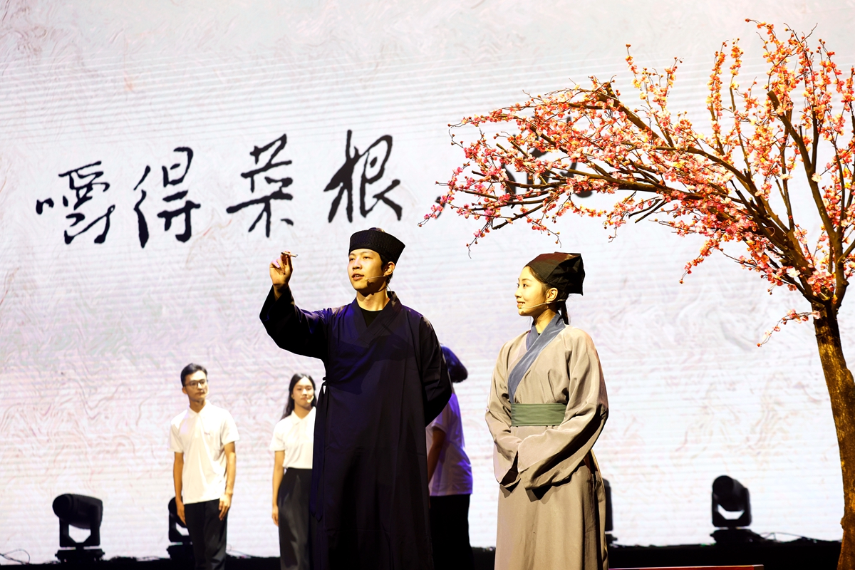 第一篇章“初心如磐 嘱托领航”以情景剧的形式演绎了一代代东大人赓续红色血脉,投身教育救国、教育兴国、教育强国的动人故事。东南大学校史专家刘云虹、“红色梅庵”讲解团志愿者以“梅庵”为起点,将“团二大”的召开、“黎明前最后倒下的雨花英烈”成贻宾以及西南服务团的故事娓娓道来。感人至深的讲述引发全场共鸣,2024级新生代表表示,在中国式现代化建设新征程上,新一代东大人将以梅庵精神为指引,深入践行习近平总书记的重要回信和考察紫金山实验室的重要指示精神,牢记初心使命、勇攀科技高峰,为中国式现代化助力添彩。
